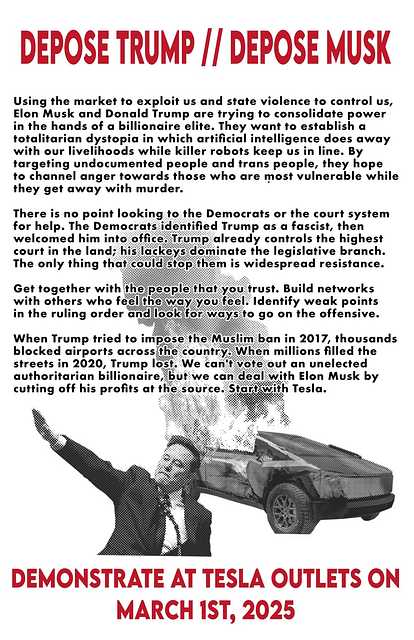 Using the market to exploit us and state violence to control us, Elon Musk and Donald Trump are trying to consolidate power in the hands of a billionaire elite. They want to establish a totalitarian dystopia in which artificial intelligence does away with our livelihoods while killer robots keep us in line. By targeting undocumented people and trans people, they hope to channel anger towards those who are most vulnerable while they get away with murder.