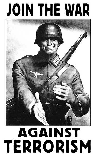 A poster we designed in a more innocent time, when it was still possible to discredit the US government by pointing out the fascist undertones of the so-called “war on terror.” Nowadays, we can imagine a poster like this being designed by supporters of the government as an unironic endorsement of fascism.