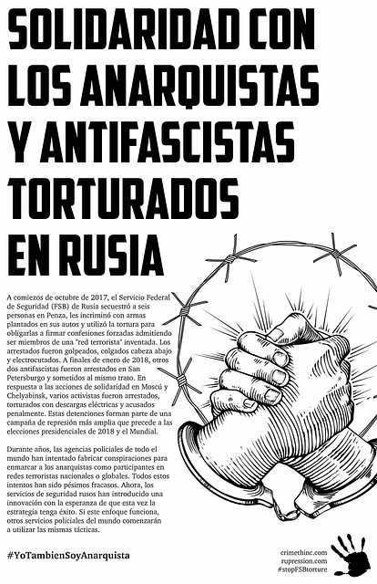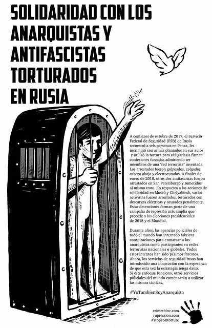 A comiezos de octubre de 2017, el Servicio Federal de Seguridad (FSB) de Rusia secuestró a seis personas en Penza, les incriminó con armas plantados en sus autos y utilizó la tortura para obligarlas a firmar confesiones forzadas admitiendo ser miembros de una “red terrorista” inventada. Los arrestados fueron golpeados, colgados cabeza abajo y electrocutados. A finales de enero de 2018, otros dos antifascistas fueron arrestados en San Petersburgo y sometidos al mismo trato. En respuesta a las acciones de solidaridad en Moscú y Chelyabinsk, varios activistas fueron arrestados, torturados con descargas eléctricas y acusados penalmente. Estas detenciones forman parte de una campaña de represión más amplia que precede a las elecciones presidenciales de 2018 y el Mundial.
